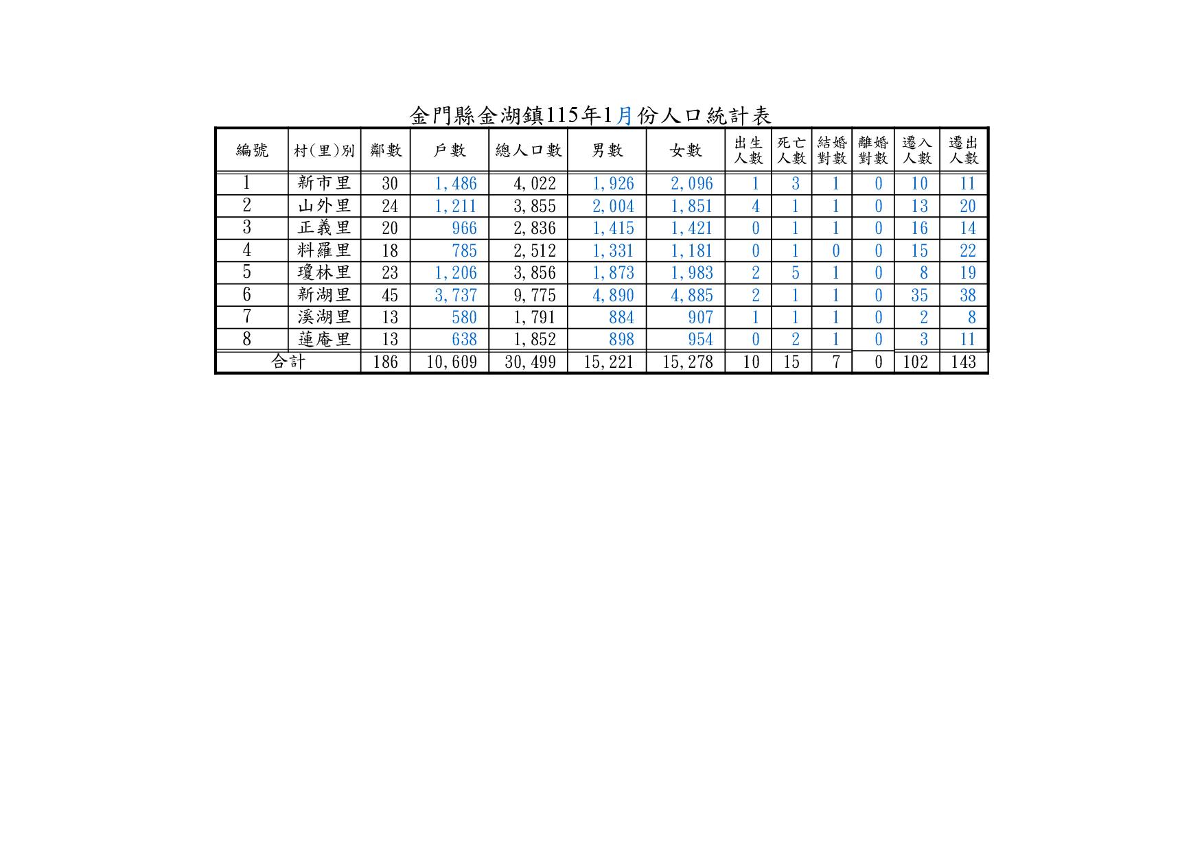 金門縣金湖鎮115年1月份人口統計表